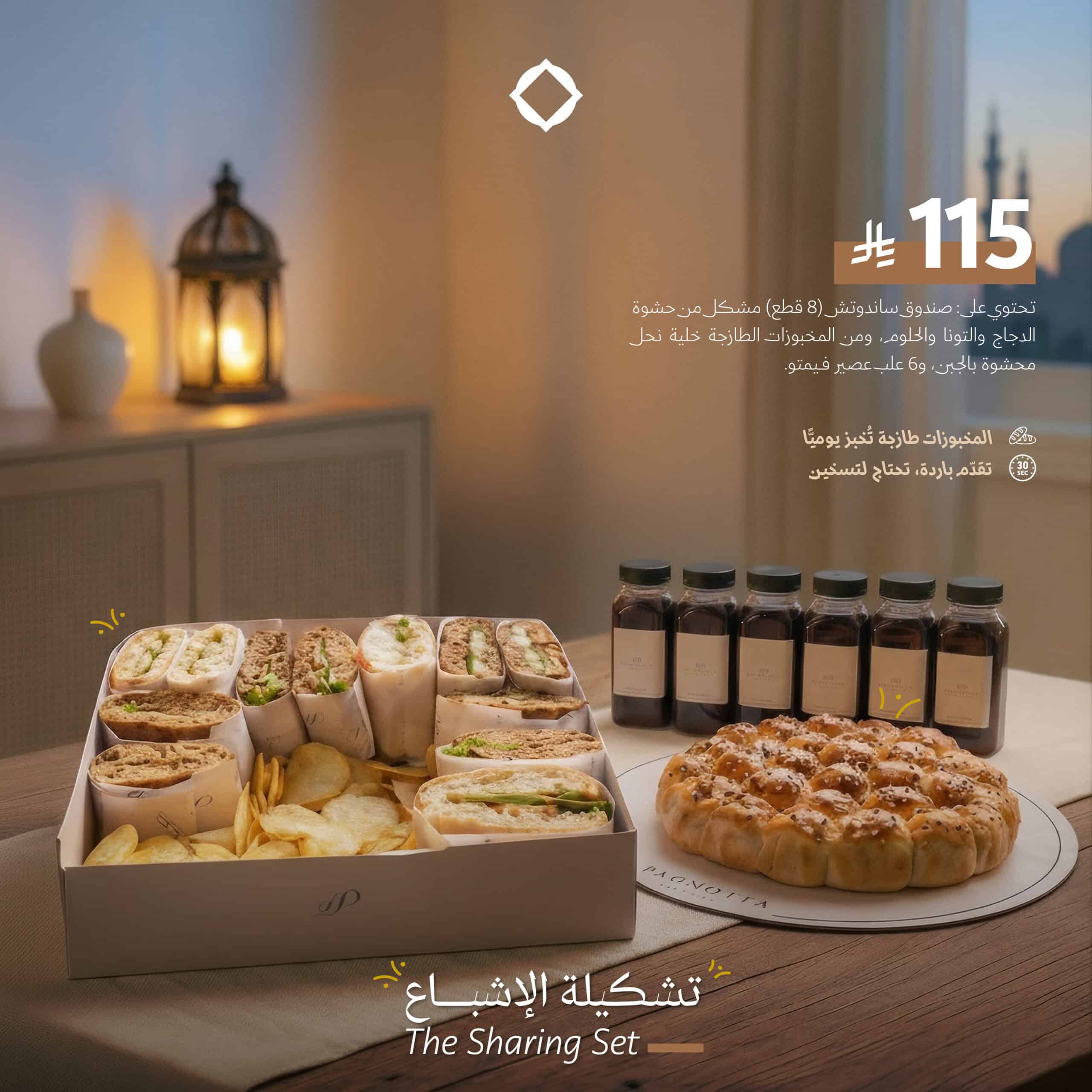 تحتوي على: صندوق ساندوتش (8 قطع) مشكل من حشوة الدجاج والتونا والحلوم، ومن المخبوزات الطازجة خلية نحل محشوة بالجبن، وصندوق شوكولاته بلجيكية غنية بالطعم، و6 علب عصير فـيمتو، وصينية قهوة سعودية تقدم مع التمر.