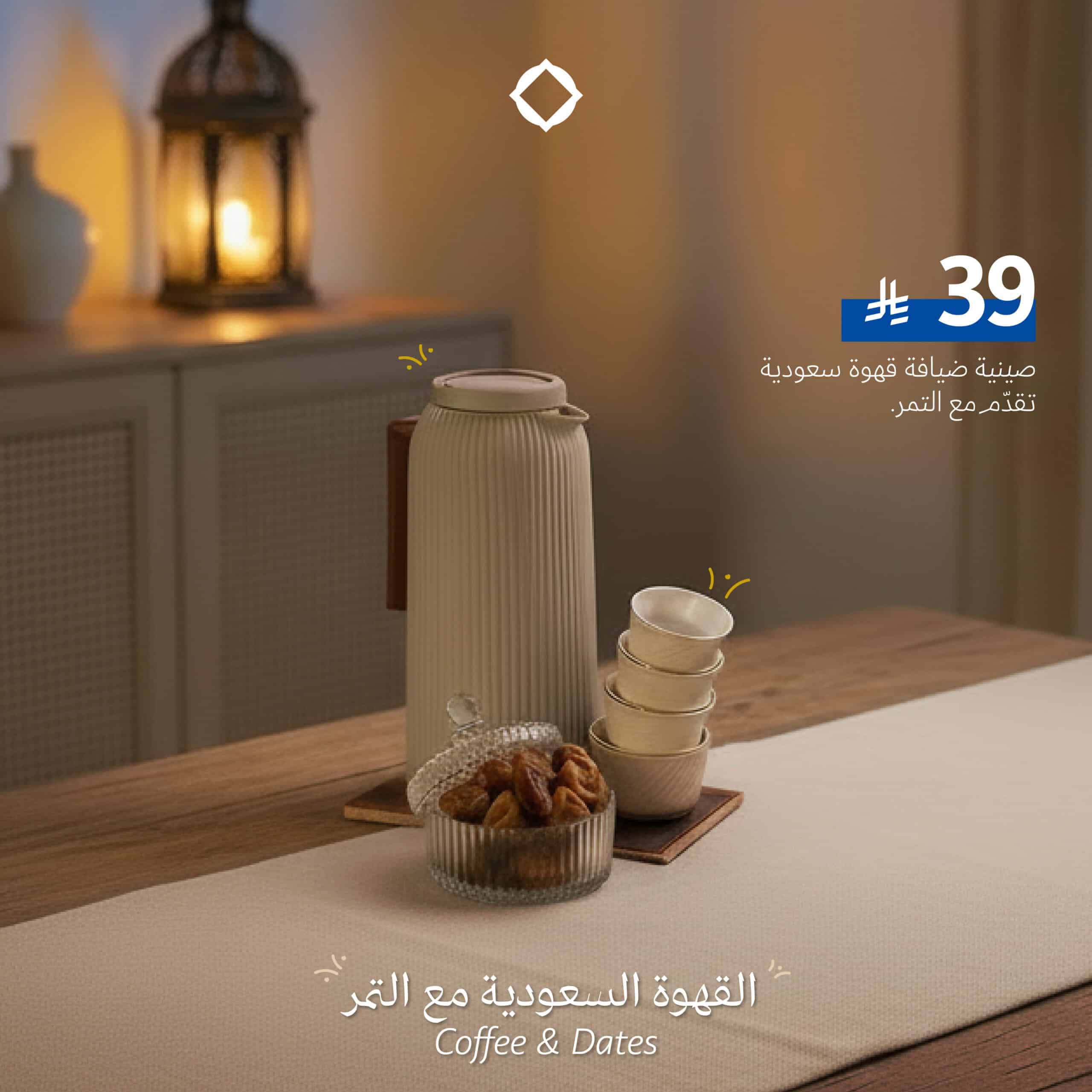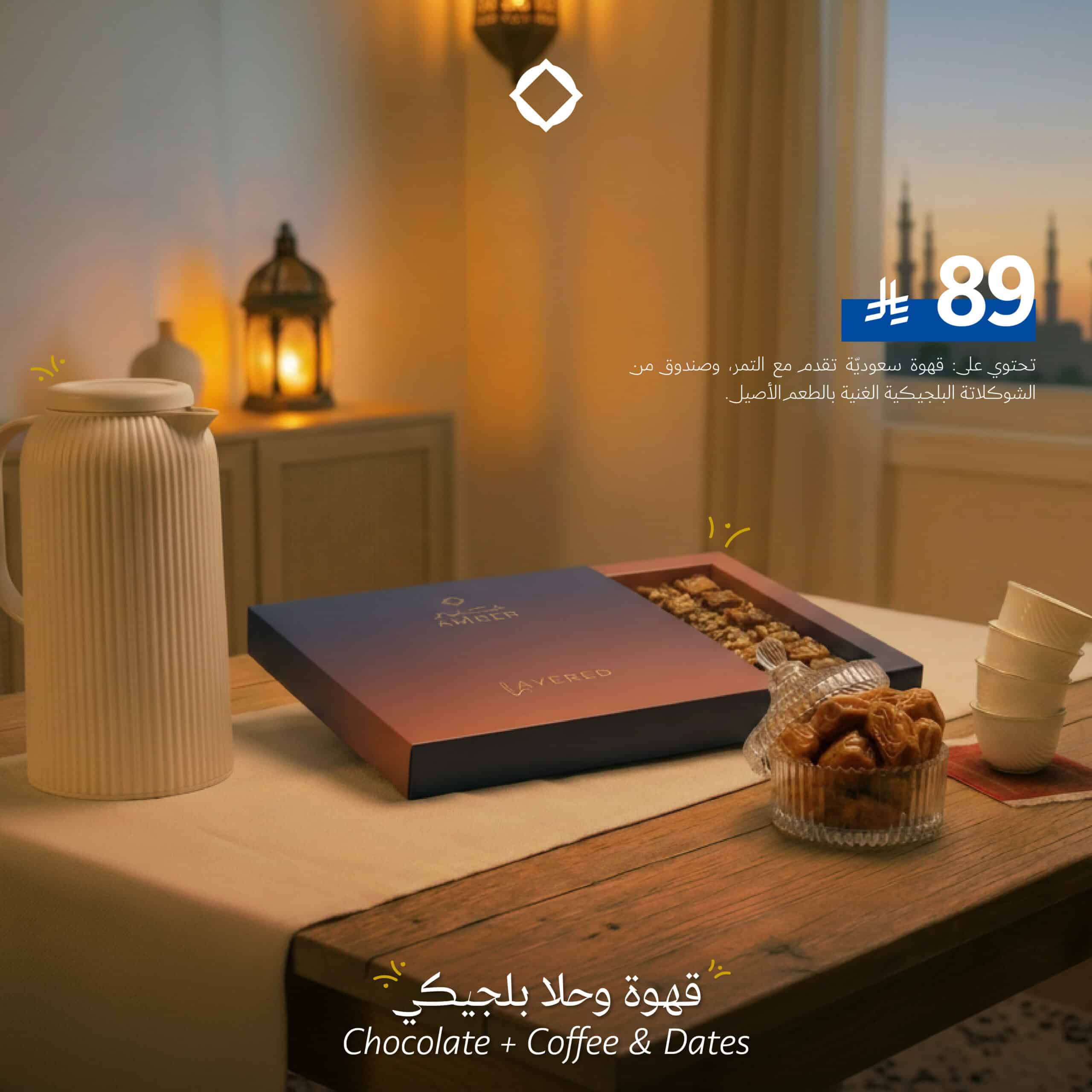 تحتوي على: قهوة سعوديّة تقدم مع التمر، وصندوق من الشوكلاتة البلجيكية الغنية بالطعم الأصيل.